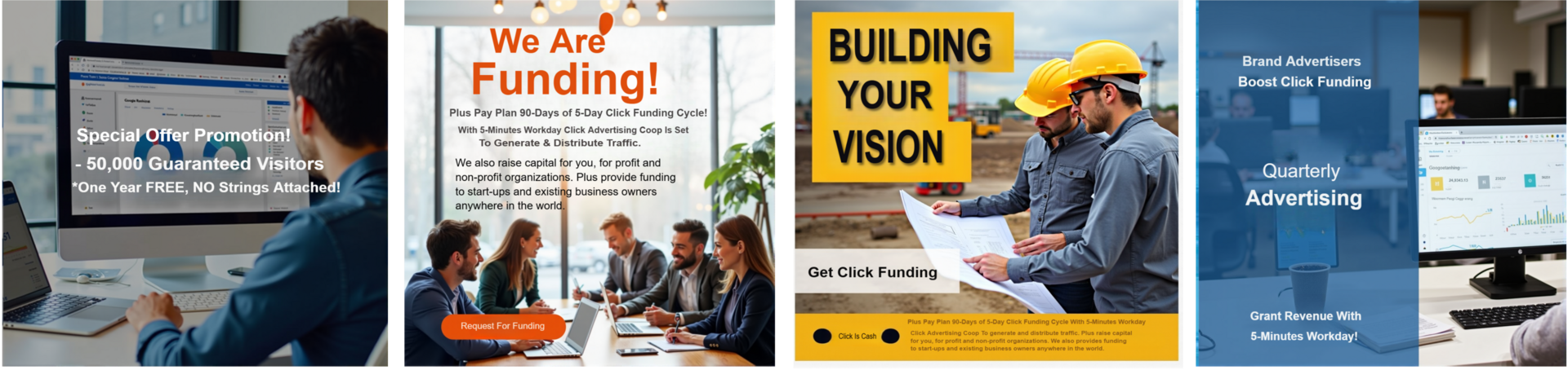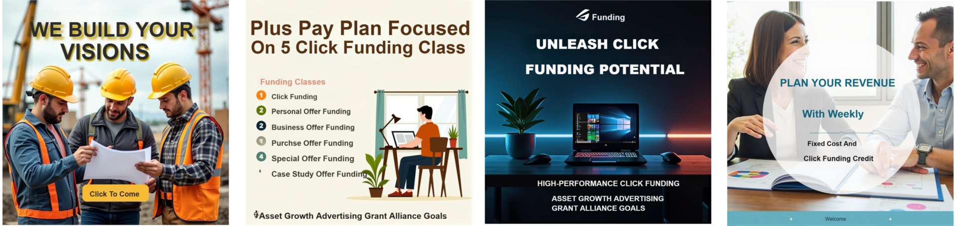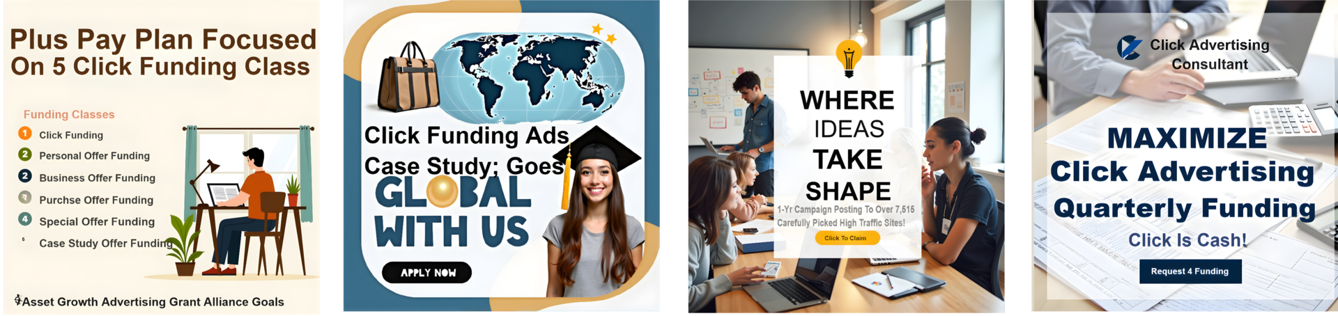 Build An Online Asset Growth Advertising Grant Alliance Goals Site; that Focused on Fixed Click Funding Coop, to generate and distribute traffic; plus raise capital for you, for consumers and business owners. No Location Barrier. You work 5-minutes daily for 5-days weekly. You click and watch 5 thirty second ads.